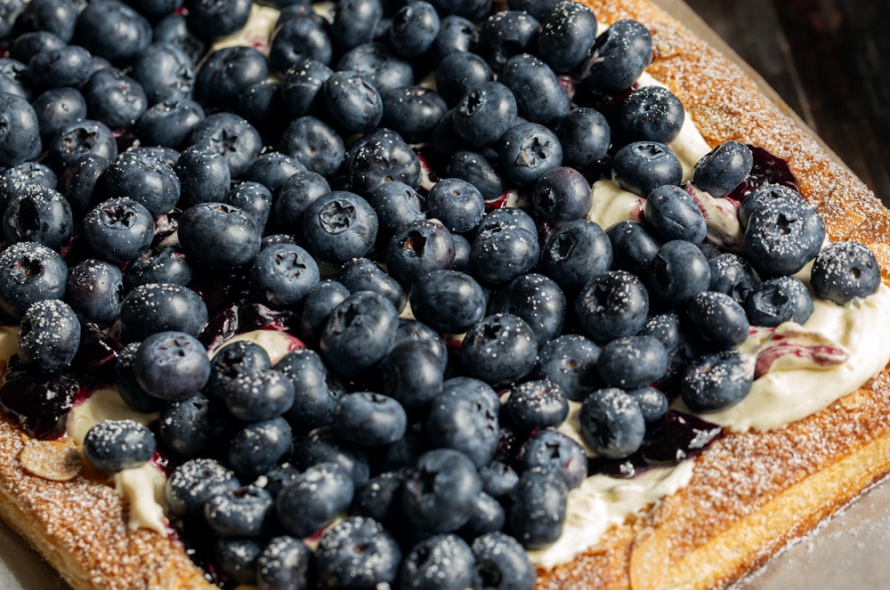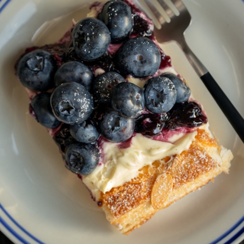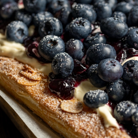 Store-bought puff pastry, sprinkled with raw sugar and almonds, gets baked until golden and flaky, then topped with vanilla mascarpone cream and an abundance of blueberries.