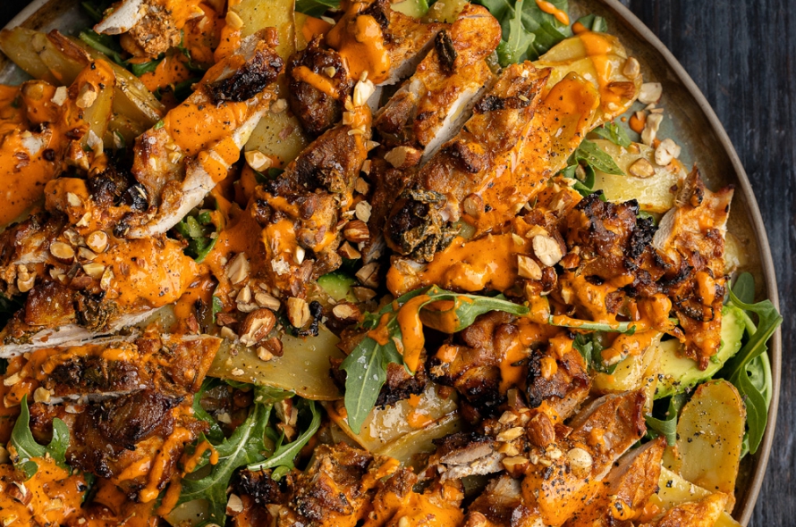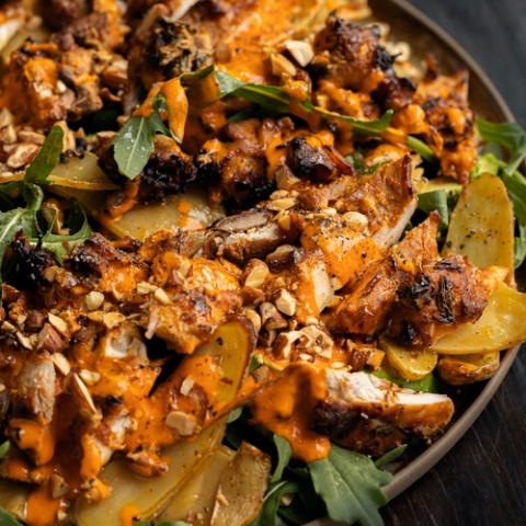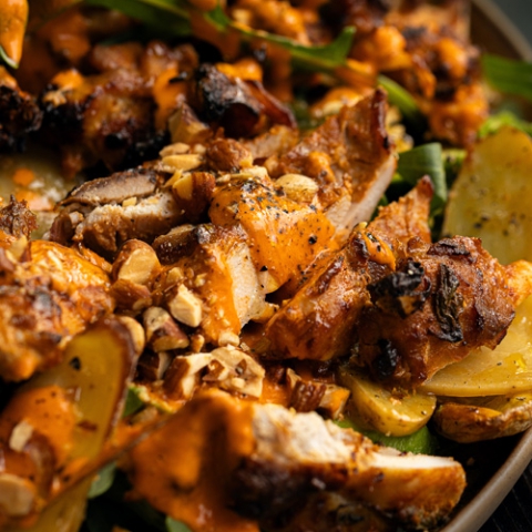 Smokey chicken thighs baked on a bed of paper-thin roasted potatoes, all topped with a creamy roasted red pepper sauce.