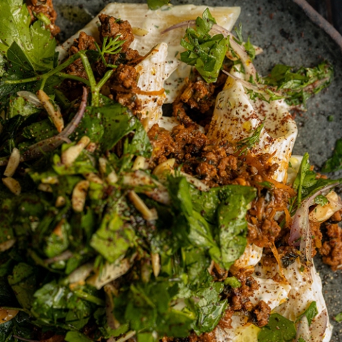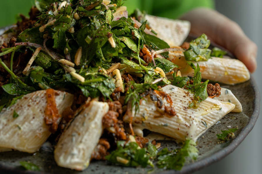 Yoghurt Pasta with Spiced Beef & Fresh Herb Shallot Salad