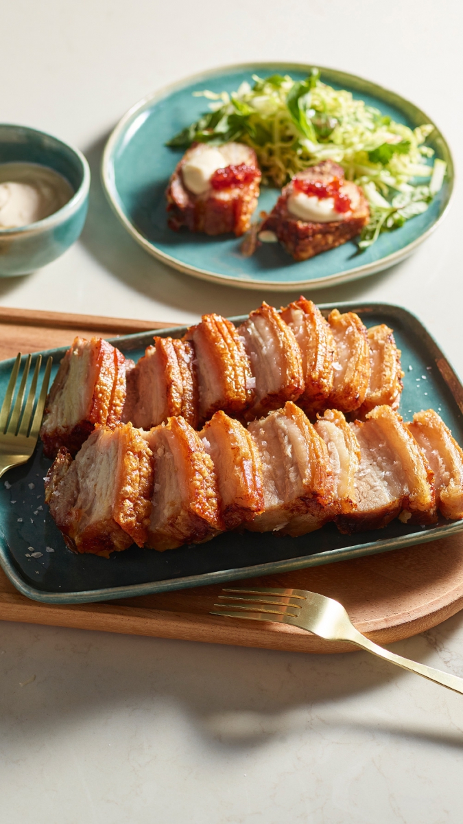 It’s pork belly at its best: crisp skin, tender meat, and a hit of heat, crunch, and creaminess on the side. The kind of dish made for slow weekends and long lunches. It looks impressive, tastes incredible, and couldn’t be easier to pull off.