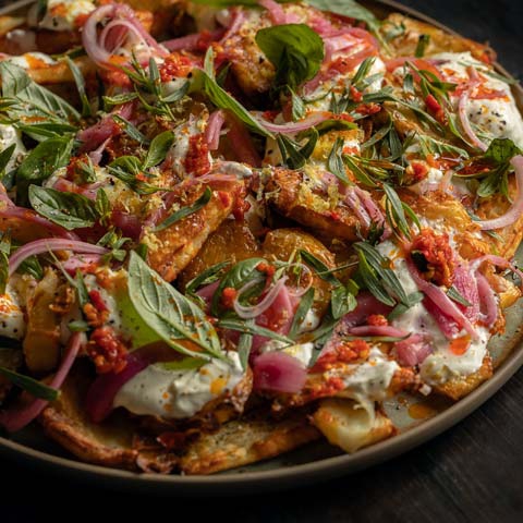 Crispy Smashed Potatoes & Halloumi with Sour Cream, Italian Chili & Fresh Herbs