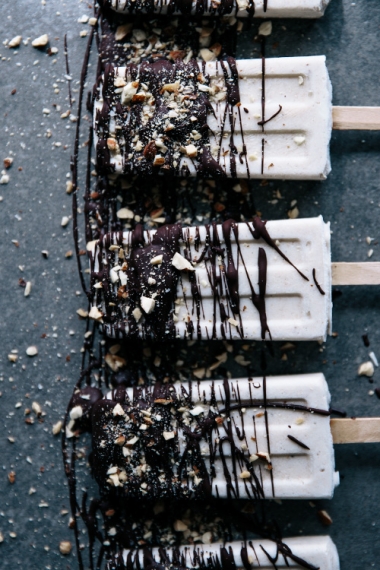 - Drizzle the chocolate over the popsicles, then sprinkle with almonds and sea salt.