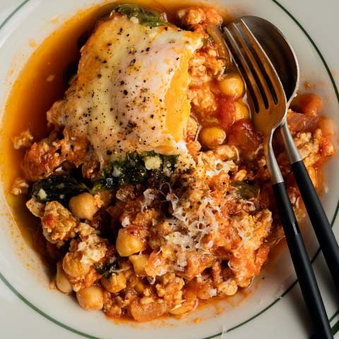 Tomato, Basil, Chicken & Chickpea One-Pan Sauce with Baked Eggs