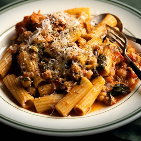 Tomato, Basil, Chicken & Chickpea One-Pan Sauce with Pasta