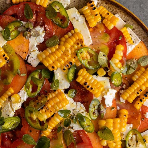 Tomato, Feta, Peach & Charred Corn Salad with Olive Oil & Fresh Green Chili
